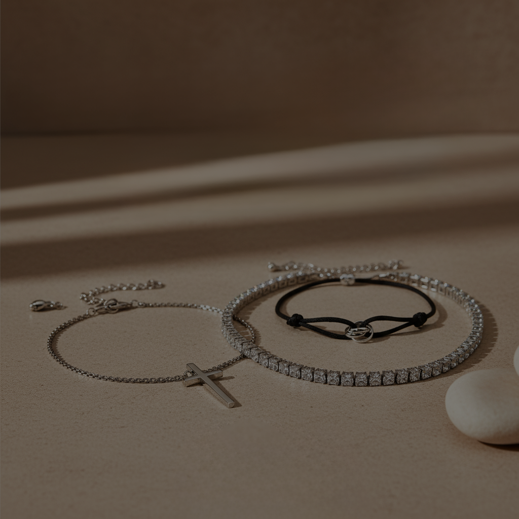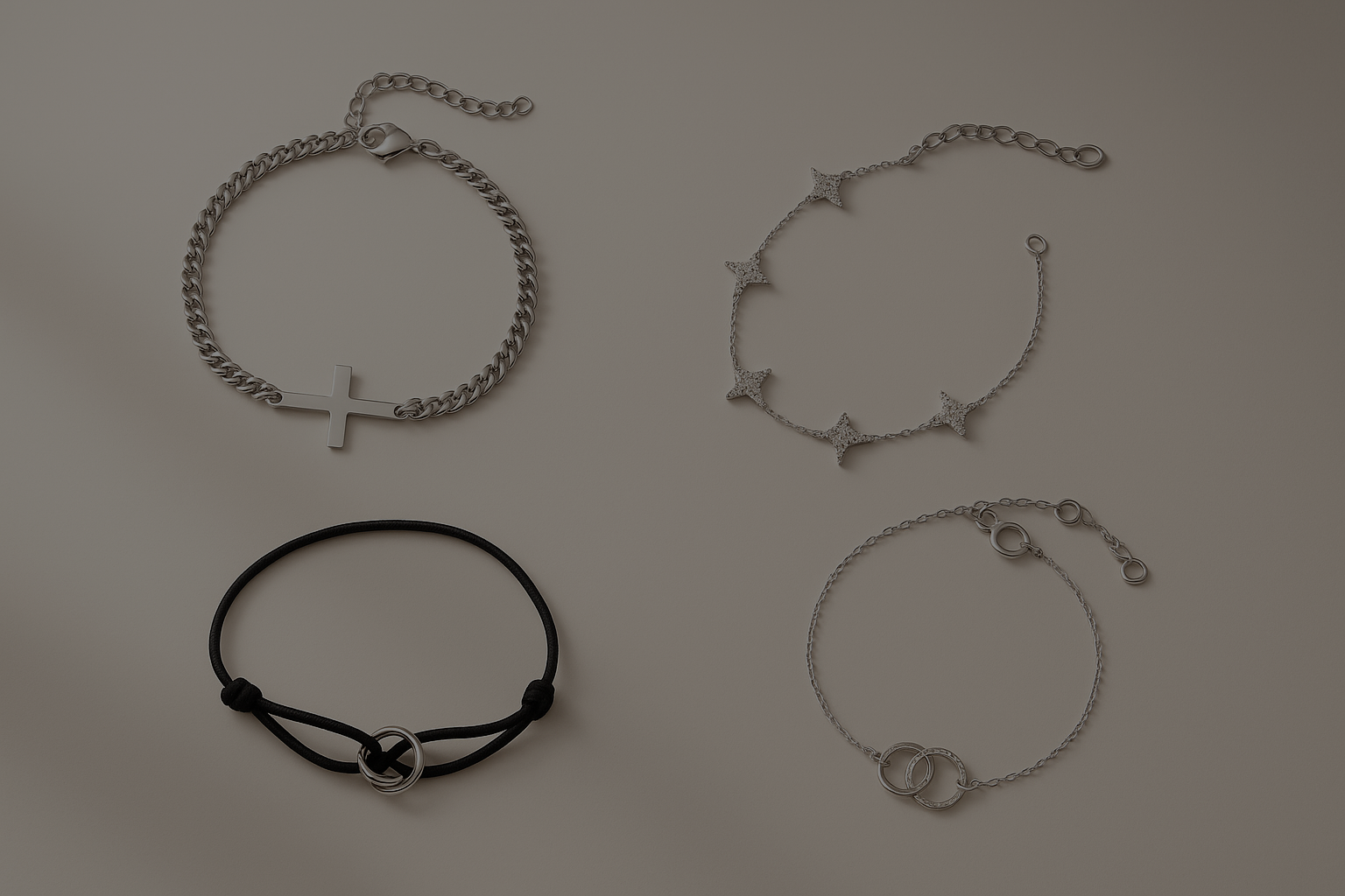 Modelle mit Kordel haben einen Schiebe- oder Knotenverschluss und sind stufenlos verstellbar; Edelstahl-Glieder/Cuffs werden per Verschluss geschlossen und kommen in festen Längen. (Auf der Produktseite steht „verstellbar“, wenn zutreffend.)